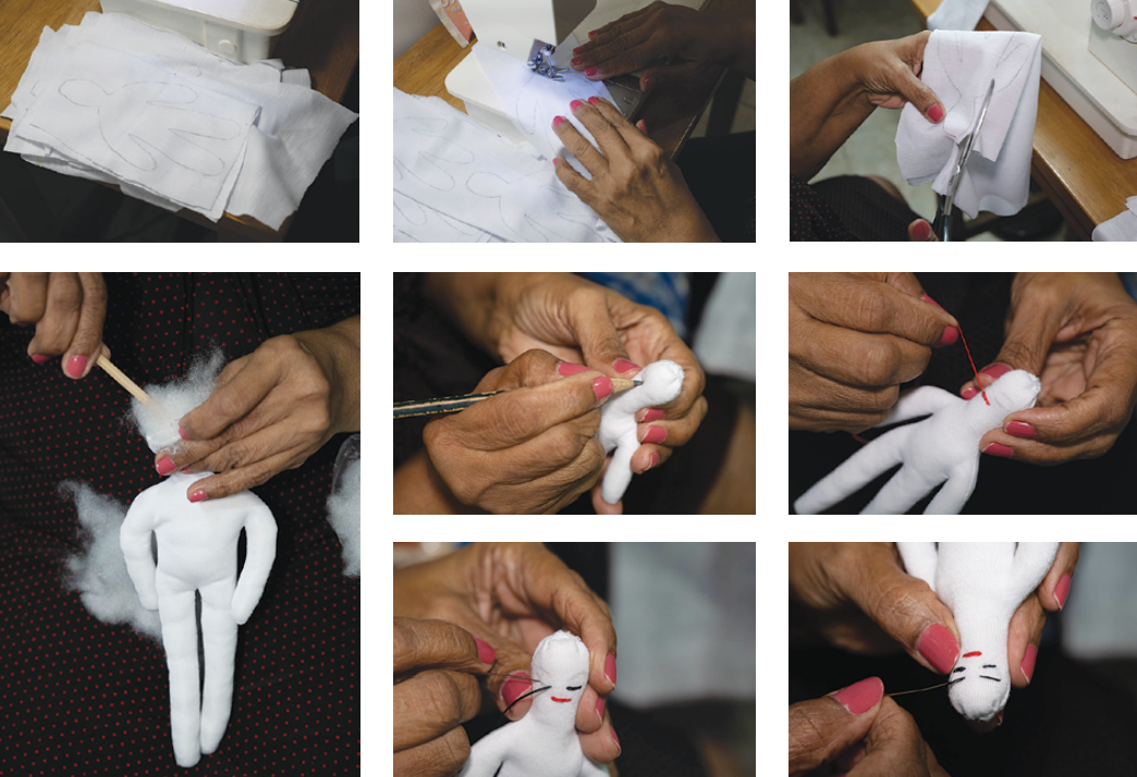 Com a costura inicial, cada parte da boneca vai recebendo parte do enchimento, distribuído para dar forma ao brinquedo. Em seguida, são costurados os braços e pernas, unindo-as à cabeça com pontos firmes para não abrir.