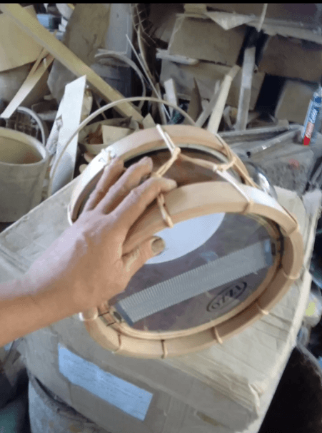 - Aros: peça com os furos por onde a corda irá passar. Colocados na parte superior e inferior, eles envolvem a pele que está colocada sobre a arquilha e, através da pressão exercida pelas cordas, amarradas de diferentes formas seguindo a tradição de cada Nação, “descem” mais próximos ao bojo, esticando a pele e dando a afinação necessária. Para dar o formato de aro à ripa de madeira, primeiramente Maureliano utilizou rodas de bicicleta, depois evoluiu a ferramenta desenvolvendo moldes de metal com ajustes. Após a moldagem, realizava o acabamento com lixa e fazia a furação. Para essas peças, Maureliano dava preferência ao jenipapo devido a sua flexibilidade e, de modo a contribuir com sua preservação, investia o lucro de suas vendas na plantação de novas árvores.