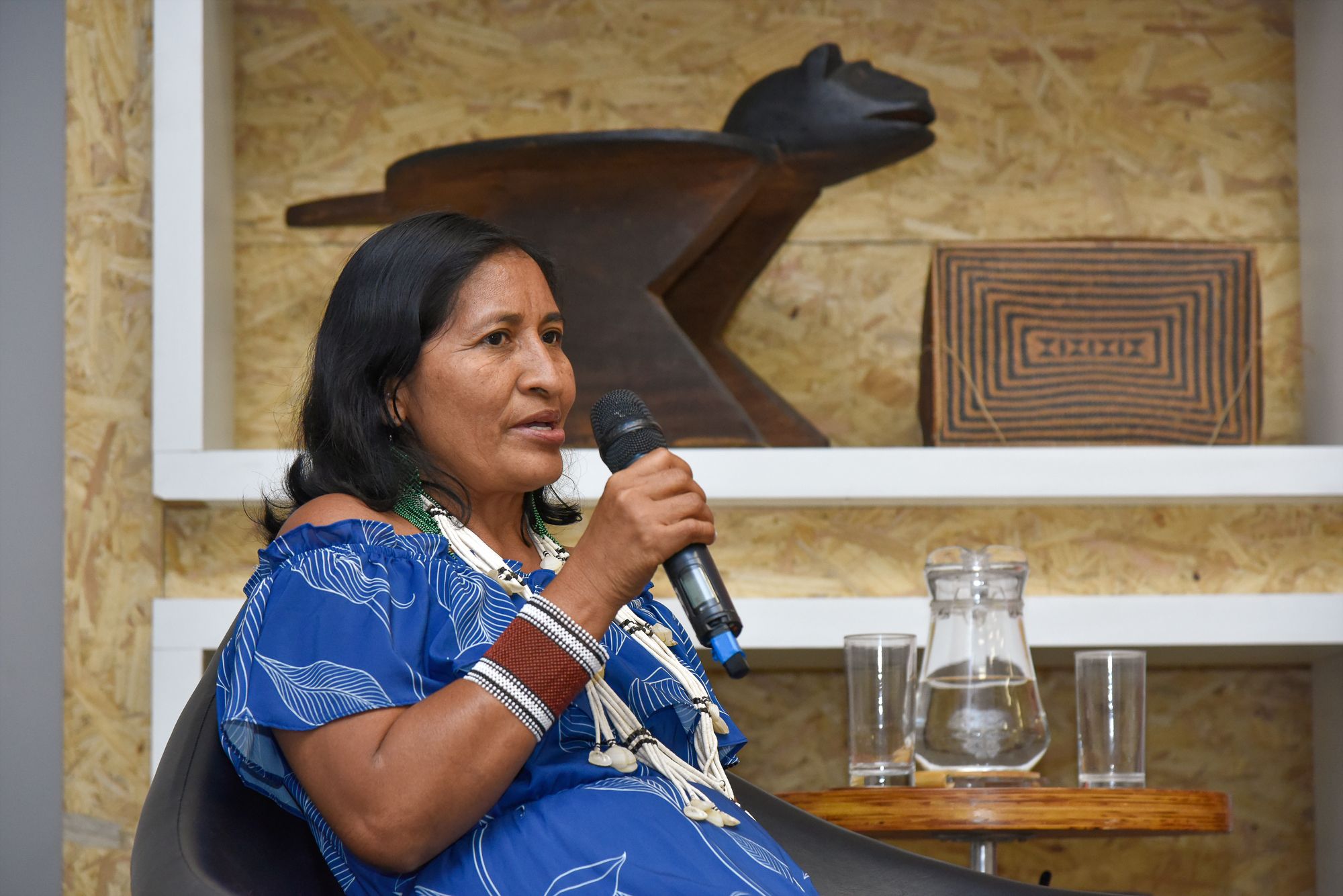Maria Amélia Marubo no III Seminário Mãos que Promovem o Brasil vestindo colar de aruá. Foto: Acervo / CRAB (2025).