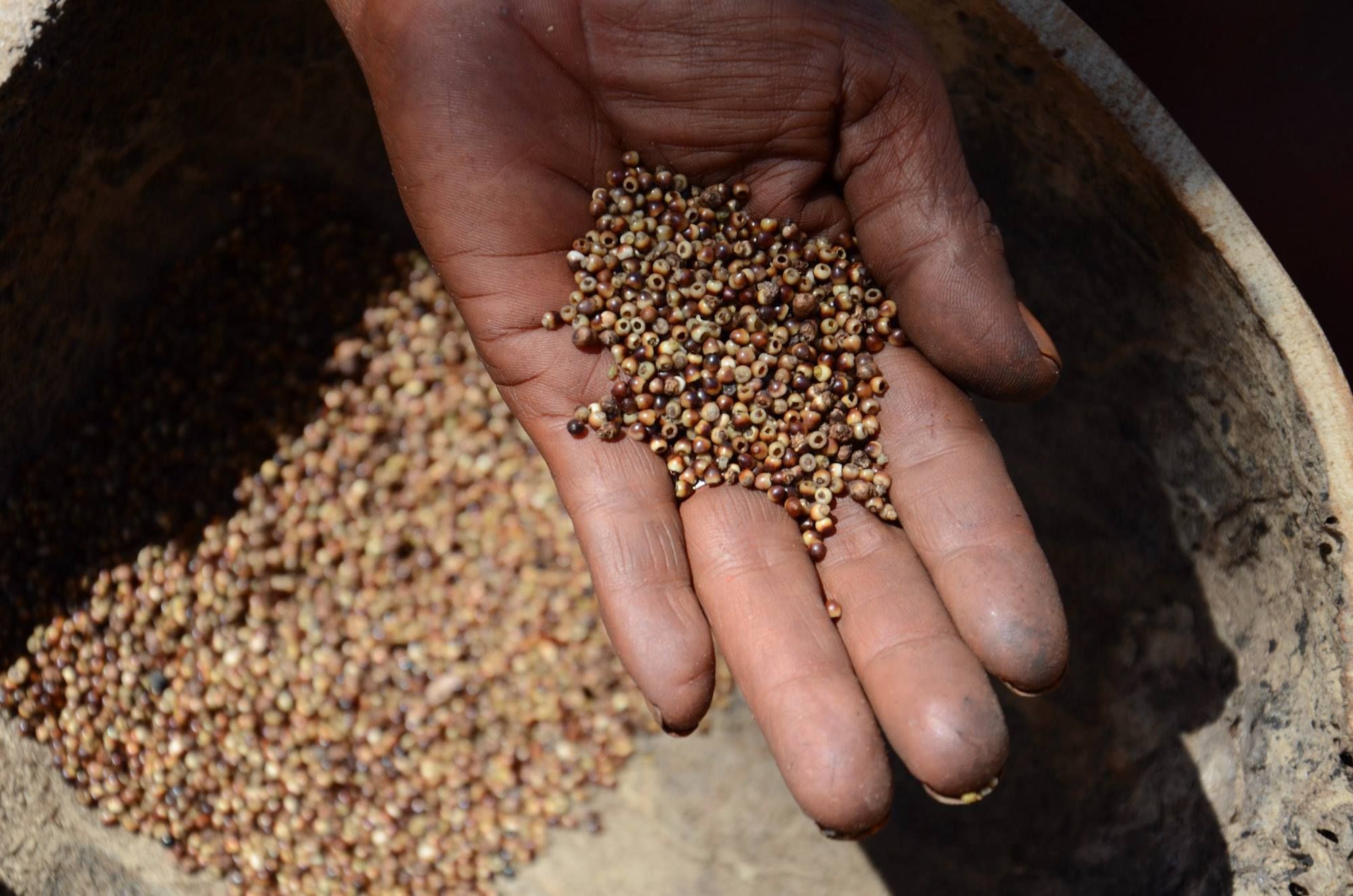 As sementes precisam germinar para que seja retirada essa parte e, com ajuda de um arame, sejam perfuradas. Uma a uma também são lixadas.