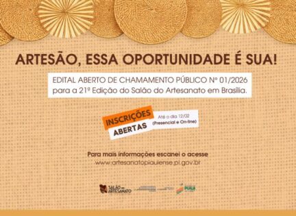 A Secretaria de Estado da Cultura do Piauí (Secult), por meio da Sudarpi e com apoio do Programa do Artesanato Brasileiro (PAB), abriu as inscrições para o Edital nº 01/2026, que seleciona artesãos para o 21º Salão do Artesanato Raízes Brasileiras, a ser realizado em Brasília, de 1º a 5 de abril. As inscrições seguem até 12 de fevereiro de 2026 e podem ser feitas presencialmente, por e-mail ou de forma online, conforme as categorias previstas no edital. Ao todo, são ofertadas sete vagas, distribuídas entre artesãos individuais e entidades representativas, com critérios que priorizam inclusão, diversidade e fortalecimento da cadeia produtiva do artesanato.